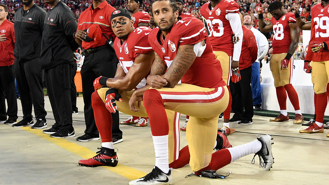 After six seasons in the NFL, Kaepernick was blackballed from the NFL for refusing to stand during the national anthem, kneeling instead.