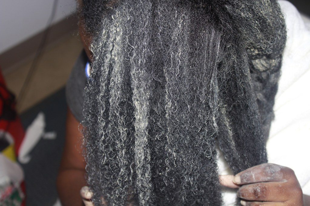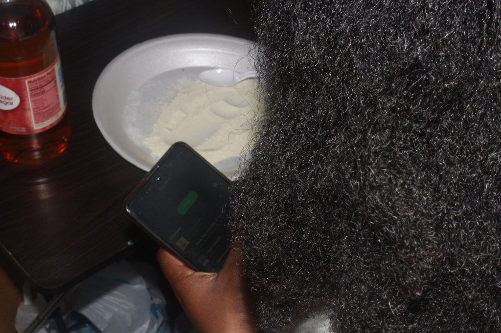 Once the atmosphere is set, Eugene is ready to start her pre-treatment of Bentonite Clay and Apple Cider Vinegar. She mixes both on a paper plate with a plastic spoon, scooping it with her fingers and lathering it onto wet strands of hair.