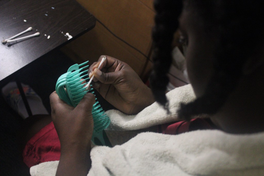 Before she begins detangling her hair, Eugene plucks a couple Q-tips and uses them to clean her combs, tooth by tooth. Again, she splits her hair into sections and coats each one with a generous amount of leave-in conditioner. By now, she’s been working with her hair for just over five hours, and still has several steps to go.